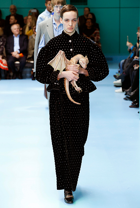 Модели носили в руках свои головы, драконов, ящериц, и иногда, сумочки: